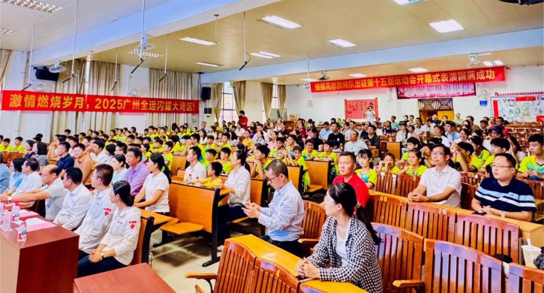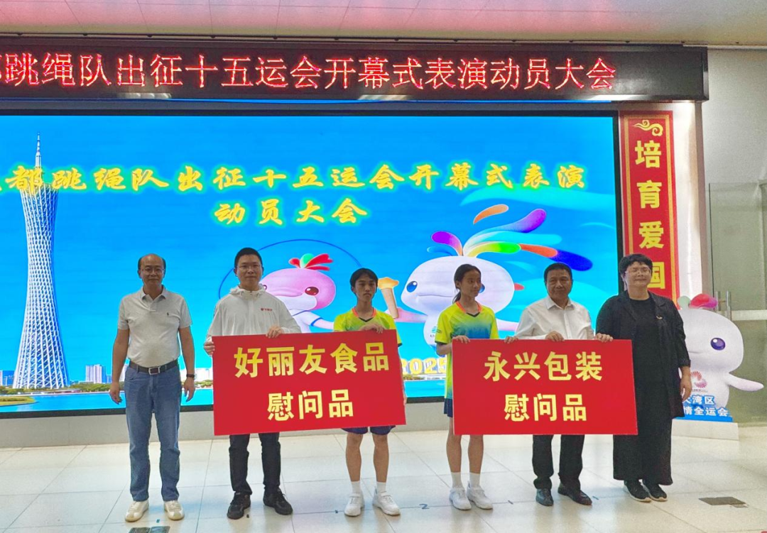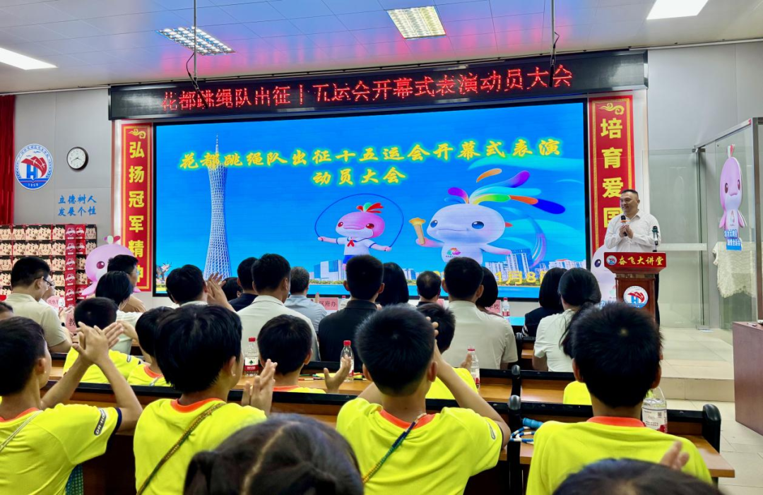 区教育局、区文化广电旅游体育局、花东镇相关负责人以及相关企业代表,与花都跳绳队全体运动员、领队、教练员及学生家长代表齐聚一堂,为即将亮相全国舞台的跳绳健儿们加油鼓劲。